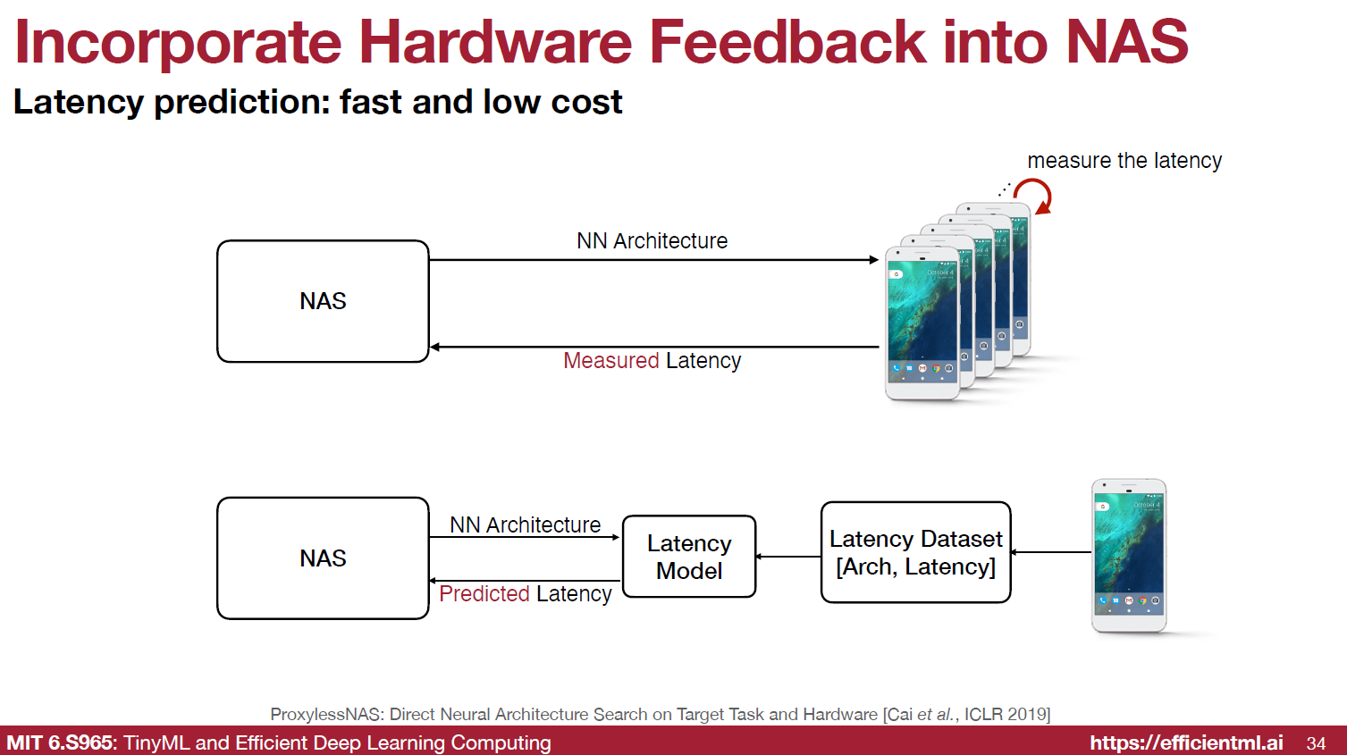 위의 그림과 같이 hardware에서 직접 측정해서 결과를 주고 받는것이 아닌 latency prediction모델에서 예측된 latency를 받아 NAS에서 활용하는 것이다. 이를 위해 hardware에서 특정 architecture들과 그 architecture의 latency를 미리 측정해서 dataset으로 만들어 latency 모델을 학습시켜 놓고 NAS에서 architecture를 찾으면 latency model에서 어느 정도의 속도가 나올지 예측을 해준다. 보통 layer-wise로 특정 layer의 input, output, kenel size, channel size등을 input으로 받고 그에 대한 latency를 output으로 가지는 식으로 latency lookup table을 만들어 활용한다. 이렇게 학습된 latency prediciton 모델을 실제와 거의 똑같은 수준으로 latency를 예측해준다고 한다. 이러면 훨씬 빠르고 적은 비용으로 NAS방법을 사용해 architecture를 찾을 수 있다고 한다.
