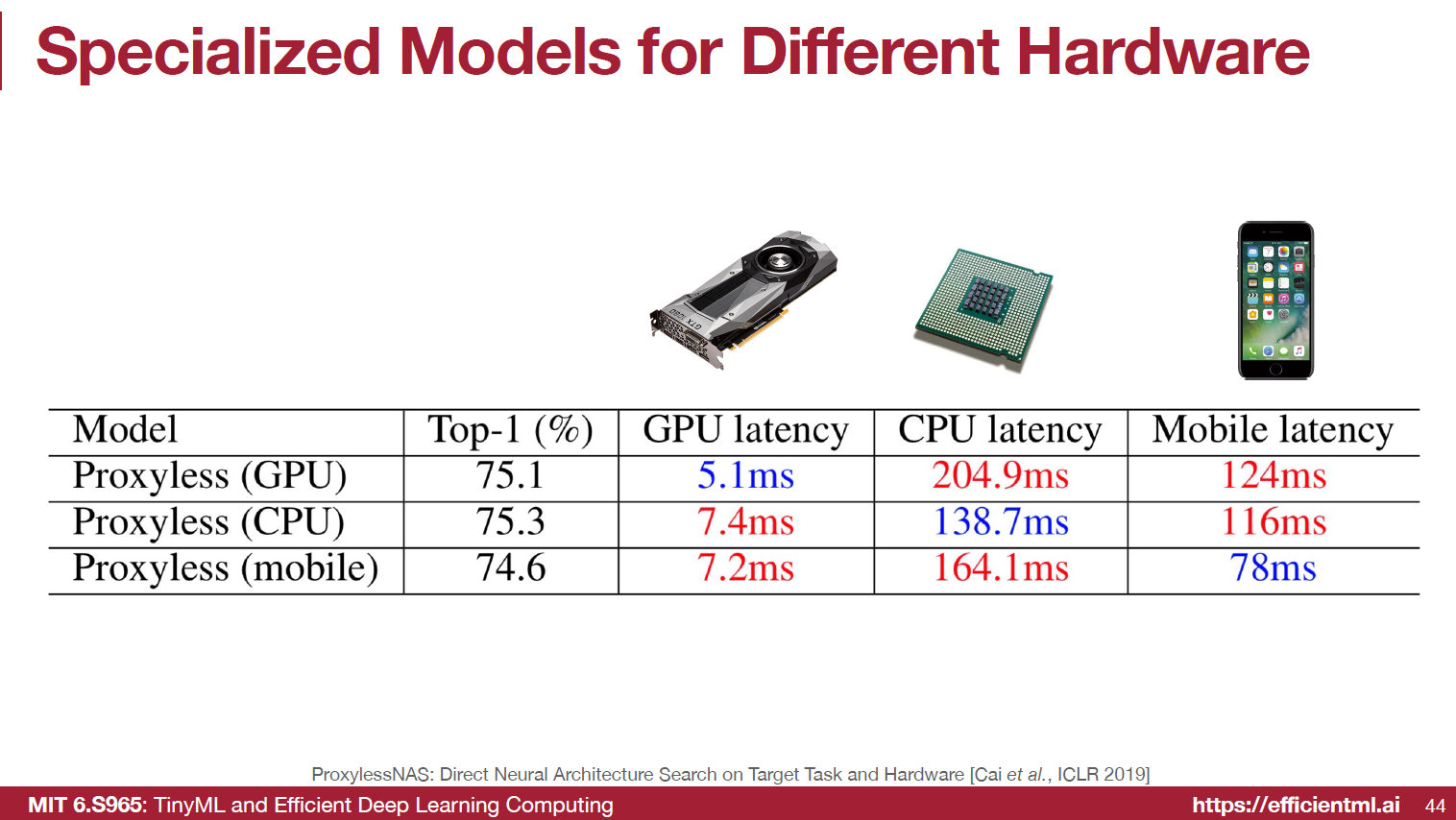 위의 표에서 볼 수 있다시피 NAS 방법으로 찾은 NASNet이나 AmoebaNet같은 경우가 MACs수는 MobileNet-V2보다 작지만 속도는 더 느린 것을 볼 수 있다. 또한 오른쪽 표에서는 hidden dimenssion수를 늘리거나 layer수를 늘리는데 비슷한 FLOPs수를 가지지만 hidden dimenssion은 늘어나도 gpu에서 속도차이가 크게 없는데 비해 layer를 늘리는 쪽은 gpu에서 속도 차이가 많이 나는 것을 볼 수 있다. 또한 gpu말고 라즈베리같은 다른 기기에서는 또 다른 경향을 보인다. 그런데 이러한 하드웨어 별 속도차이를 NAS에 추가하기 위해 하드웨어에서 속도를 측정하는 과정을 NAS에 넣으면 이 또한 굉장히 process를 무겁고 오래걸리게 만든다. hardware에서 측정하고 다시 결과를 이용해서 search를 하고 이러한 과정이 느리고 비싸기 때문이다.