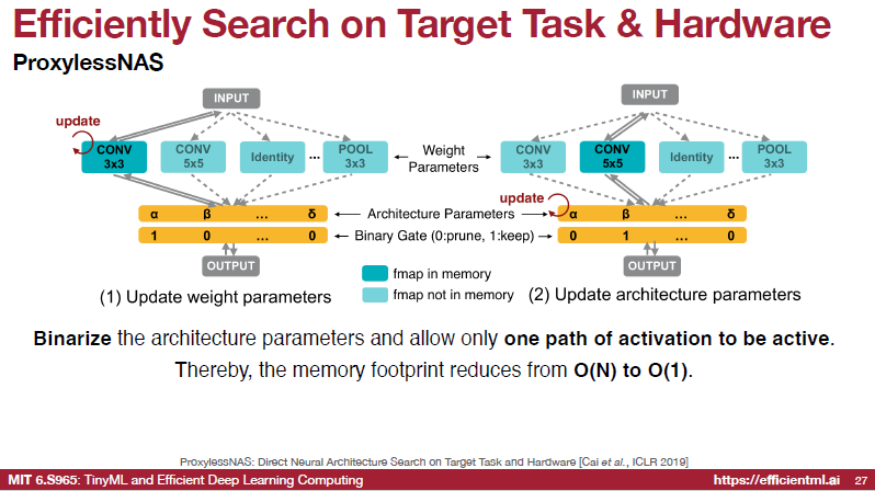 이러한 proxy task를 쓰지 않고 search 방법자체를 효율적으로 바꾸려는 시도들도 있었는데 그 중 하나가 ProxylessNAS 방법이다.